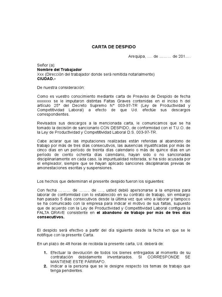Carta De Despido Con Justa Causa Modelo Ejemplo