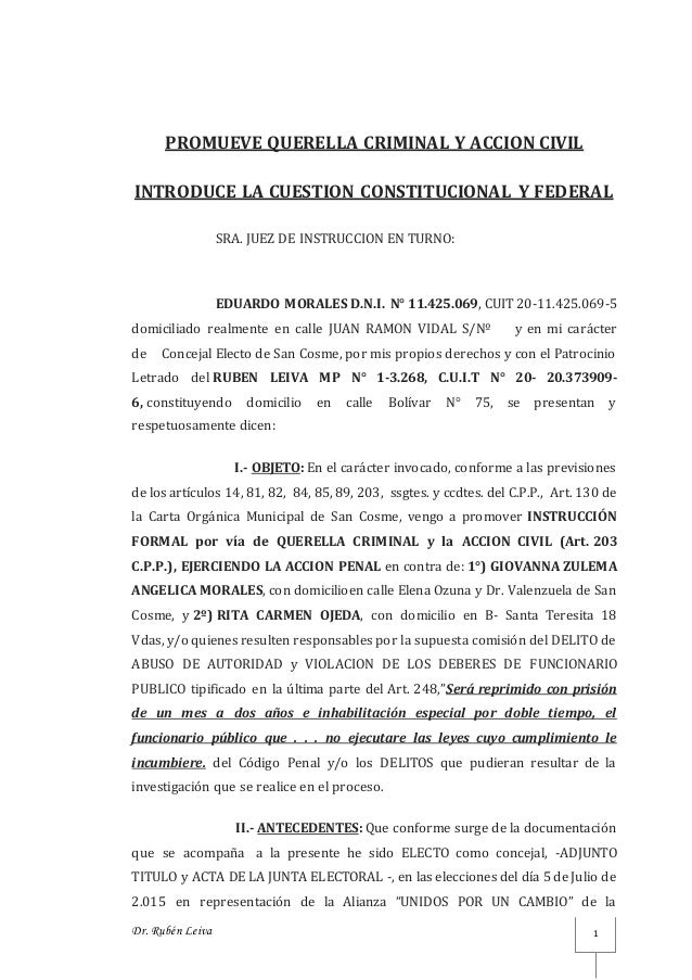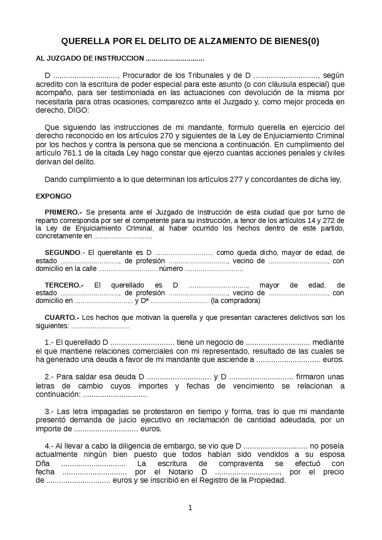 Criminal por medio del presente formulo QUERELLA CRIMINAL POR FALSEDAD EN DOCUMENTO PRIVADO contra nombre querellado con domicilio a efectos de notificaciones en calle. El querellante es mi representada Doa. Modelo querella criminal estafa 5356 resultados para querella criminal modelos El nuevo modelo de suspensin de la ejecucin de las penas privativas de la libertad.